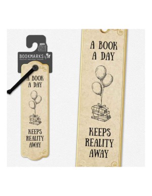- boekenlegger met opdruk: A book a day keeps reality away