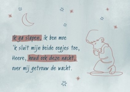 - Prentbriefkaart met opdruk: Ik ga slapen, ik ben moe 'k sluit mijn beide oogjes toe, Heere, houd ook deze nacht, over mij getrouw de wacht. Formaat: 105 x 148 mm. Meer